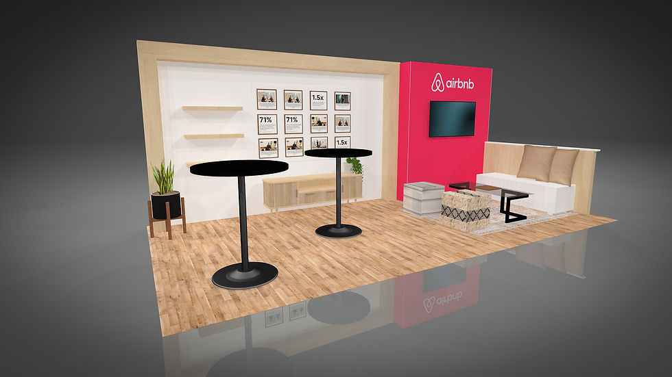 Airbnb Apartments team needed to adapt their existing 20×20 exhibit into a more compact 10×20 footprint while maintaining the look and feel of the larger environment. The primary challenge was maximizing reuse of existing components to stay within budget, while still delivering a cohesive and elevated brand experience. The final design reconfigured key elements into a flexible layout featuring both standing and soft seating conversation areas, along with a prominent swag display to attract attendees, creating a space that supported multiple engagement styles while continuing to celebrate the Airbnb brand.